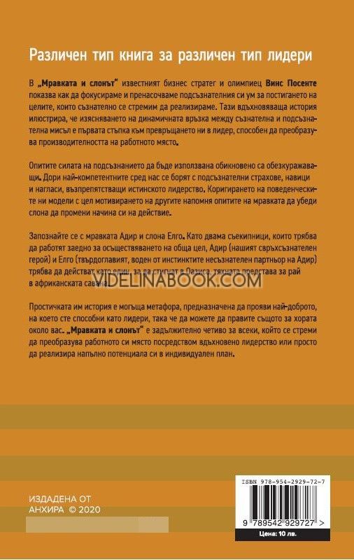 В „Мравката и слонът“ известният бизнес стратег и олимпиец Винс Посенте показва как да фокусираме и пренасочваме подсъзнателния ум за постигането на целите, които съзнателно се стремим да реализираме. Тази вдъхновяваща история илюстрира, че изясняването на динамичната връзка между съзнателна и подсъзнателна мисъл е първата стъпка към превръщането ни в лидер, способен да преобразува производителността на работното място.