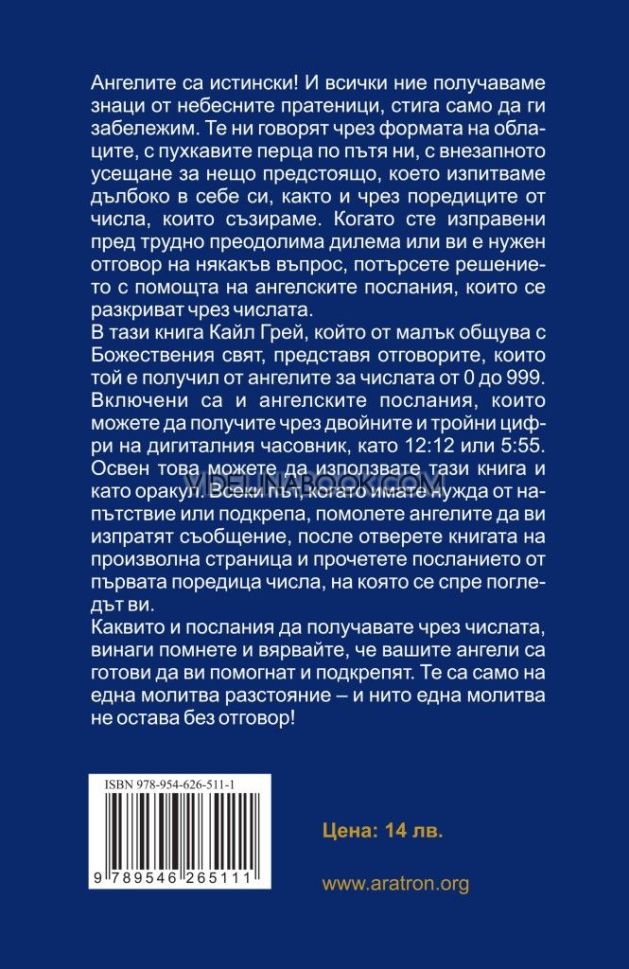 Включени са и ангелските послания, които можете да получите чрез двойните и тройни цифри на дигиталния часовник, като 12:12 или 5:55. Освен това можете да използвате тази книга и като оракул. Всеки път, когато имате нужда от напътствие или подкрепа, помолете ангелите да ви изпратят съобщение, после отворете книгата на произволна страница и прочетете посланието от първата поредица числа, на която се спре погледът ви.