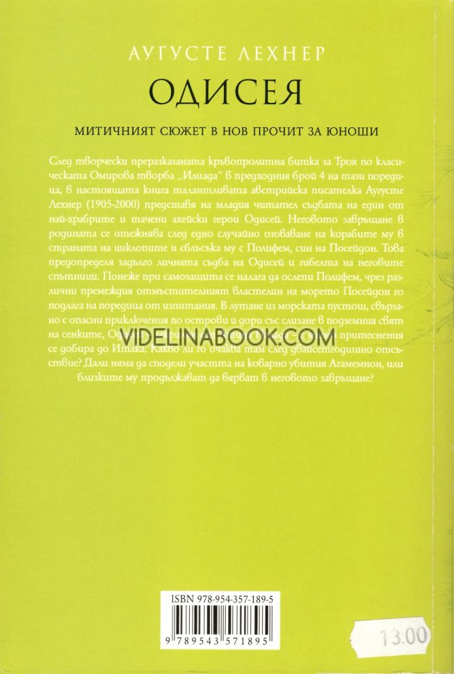 „Одисея“ на Аугусте Лехнер е преразказ на класическия Омиров епос, създаден с мисъл за младите читатели. Авторката представя приключенския път на Одисей в достъпен, увлекателен и жив стил, запазвайки дълбоката символика и моралното послание на древногръцката митология. Лехнер вплита в повествованието вечните теми за смелостта, вярата, мъдростта и силата на духа, показвайки, че истинското пътуване е не само през морета и бури, а и през човешката душа.