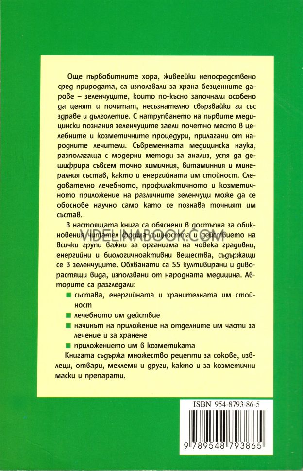 Книгата предоставя достъпна информация за градивни, енергийни и биологичноактивни вещества, съдържащи се в 55 култивирани и диворастящи вида зеленчуци, и показва как тяхното приложение може да подпомогне лечението, профилактиката и поддържането на красота. Авторите включват практически насоки за лечение, хранене, козметика, както и многобройни рецепти за сокове, отвари, мехлеми, извлеци и козметични маски. Книгата е ценен справочник за всеки, който желае да разбере науката зад лечебните и козметичните свойства на зеленчуците и да ги приложи в ежедневието си.