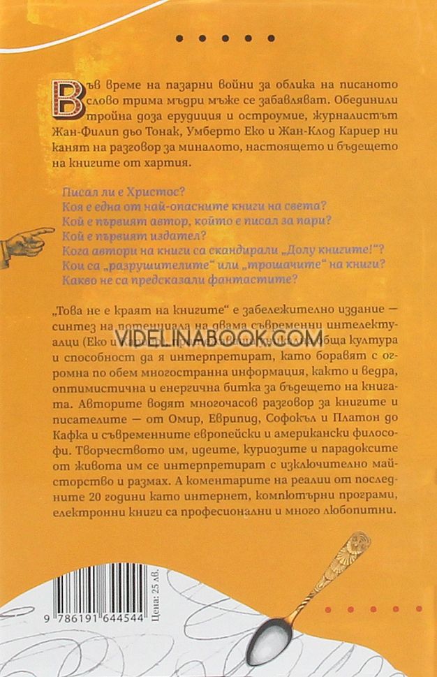 Това не е краят на книгите предлага уникален взгляд върху историята на книгата и значението ѝ в съвременния свят. Чрез интелектуален диалог между Умберто Еко, Жан-Клод Кариер и Жан-Филип дьо Тонак, читателят се потапя в миналото, настоящето и бъдещето на писаното слово, откривайки куриози, парадокси и неочаквани факти за автори, издатели и книгите, които са променили света.