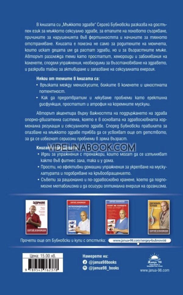 Книгата "Мъжкото здраве" на Сергей Бубновски е ценно ръководство за всеки мъж, който иска да разбере, поддържа и възстанови здравето на организма си от детството до зрелостта. Авторът, известен с новаторските си методи за възстановяване чрез движение и специални упражнения, разглежда ключовите аспекти на физическото и сексуалното здраве, като предоставя практически съвети за справяне с често срещани проблеми и насърчава активния начин на живот.