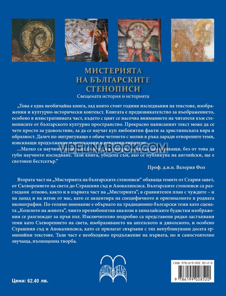 „Мистерията на българските стенописи, част втора: Свещената история и историята“ е изключително изследване, което надхвърля традиционния подход към сакралното изкуство. Авторките Веселина Вачкова и Марияна Шабаркова-Петрова не просто анализират изображенията, а ги разглеждат като живо слово, чрез което вековете разговарят. Книгата представя богословската и философската еволюция на християнската мисъл, отразена в визуалния език на стенописите, и разкрива тяхната роля като мост между духовното и земното, между традицията и личното прозрение.