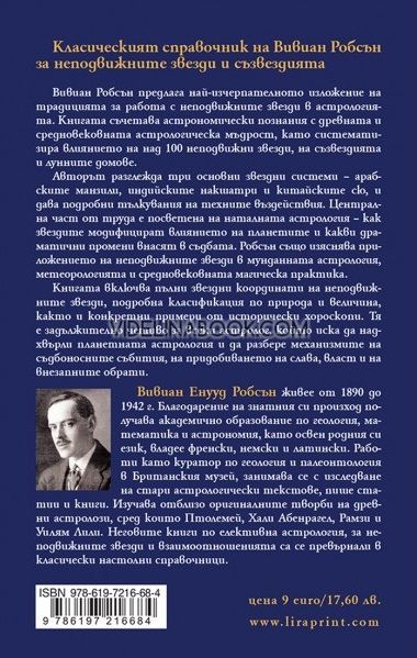 Вивиан Робсън предлага най-изчерпателното изложение на традицията за работа с неподвижните звезди в астрологията. Книгата съчетава астрономически познания с древната и средновековната астрологическа мъдрост, като систематизира влиянието на над 100 неподвижни звезди, на съзвездията и лунните домове.