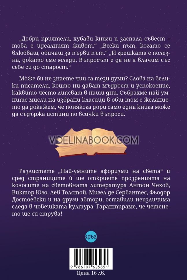 Разлистете "Най-умните афоризми на света" и сред страниците ѝ ще откриете прозренията на колосите на световната литература – Антон Чехов, Виктор Юго, Лев Толстой, Мигел де Сервантес, Фьодор Достоевски и на други автори, оставили неизличима следа в човешката култура. Гарантираме, че четенето ще си струва!