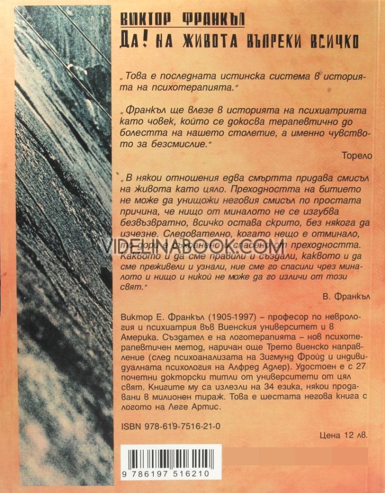 Книгата „Виктор Франкъл: Да! на живота въпреки всичко: Автобиография“ предлага дълбок поглед върху живота на Виктор Франкъл, неговите преживявания в лагерите, загубата на близки и усилията му да открие смисъл в екстремни условия. Читателят се запознава с личната и професионалната история на един изключителен психиатър и хуманист. Изданието подчертава значението на логотерапията, създадена в условия на крайна опасност, и показва как психологическите методи могат да осигурят спасение и утеха дори в най-тежките моменти.
