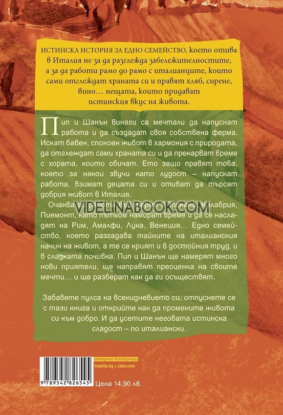 Истинска история за едно семейство, което отива в Италия не за да разглежда забележителностите, а за да работи рамо до рамо с италианците, които сами отглеждат храната си и правят хляб, сирене, вино… нещата, които придават истинския вкус на живота.За италианското умение да се живее щастливо в хармония с природата.