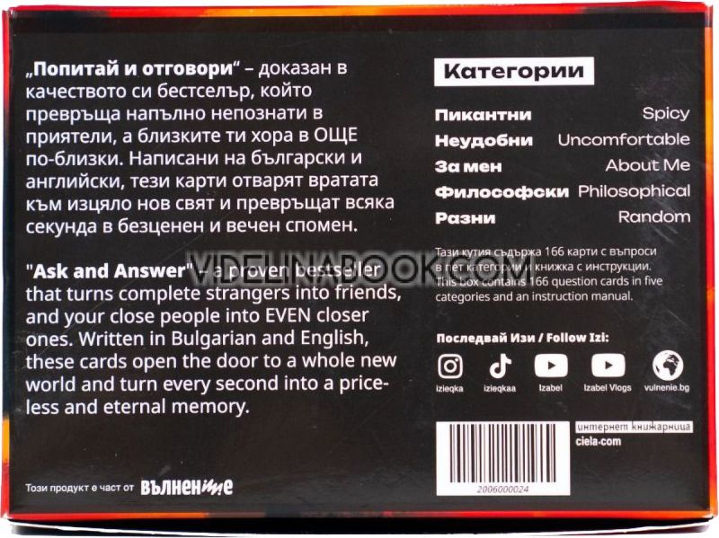 Попитай и отговори е доказан в качеството си бестселър, който превръща напълно непознати в приятели, а близките ти хора в още по-близки. Написани на български и английски, тези карти отварят вратата към изцяло нов свят и превръщат всяка секунда в безценен и вечен спомен.
