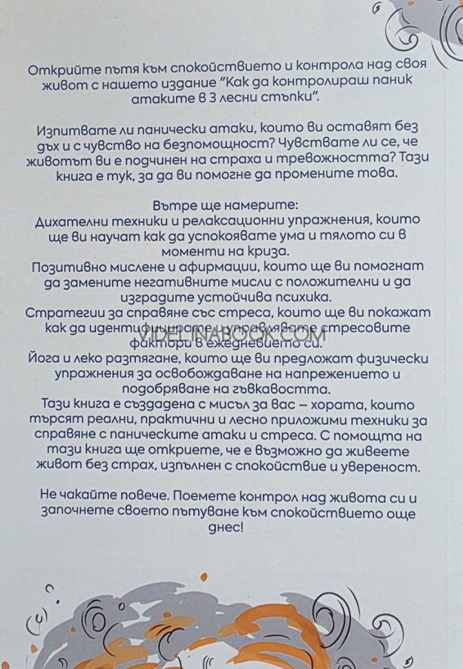 „Как да контролираш паник атаките в 3 лесни стъпки: Върни контрола над живота си!“ е практическо ръководство за хора, които искат да освободят живота си от паника, тревожност и страх. Книгата представя прост, но ефективен метод за справяне с пристъпите, без да се налага да разчитате изцяло на медикаменти или скъпи терапии. Тя е предназначена за всеки, който усеща, че паник атаките потискат ежедневието му и желае да върне контрола над себе си и живота си чрез лесни и приложими техники.