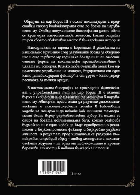 В настоящата биография са проследени житейският и управленски път на цар Борис III с акцент върху някои от най-драматичните моменти в царуването му. Авторът прави опит да разчете дипломатическата и психологическа логика в ключовите ходове на монарха и да покаже как личният темперамент влияе върху държавническия избор.